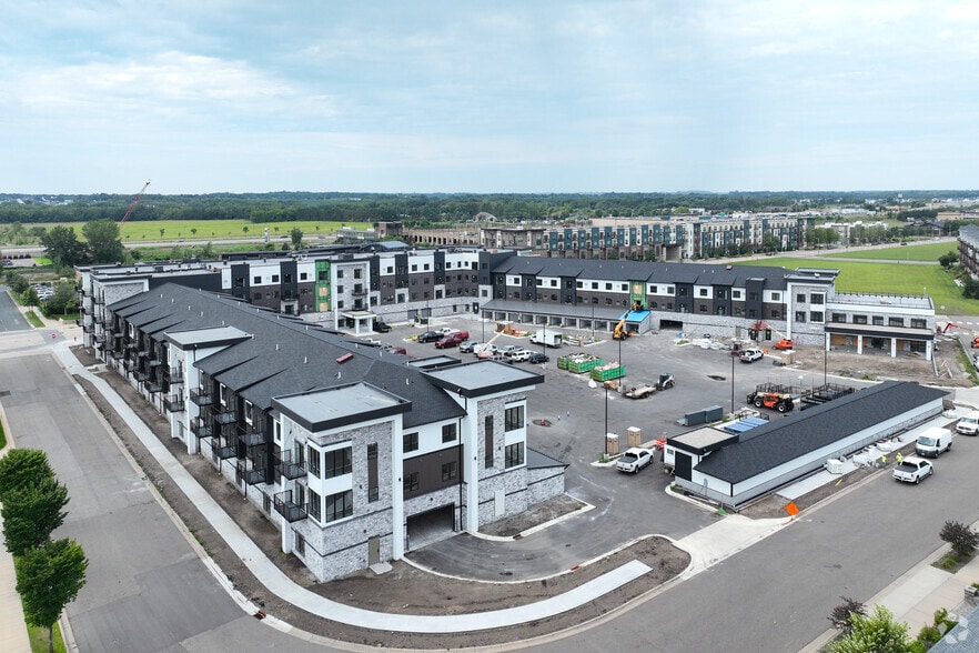 New upscale apartment community in Ramsey, MN, featuring 1, 2 & 3-Bedroom, 1-Bedroom + Den, and Studio apartment floor plans. The property features a rooftop lounge, indoor and outdoor pools, a dog park, pet wash, a sports court, a golf simulator, a fire pit & more.