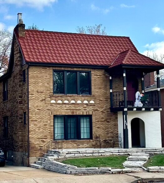 Red metal roof, brick exterior with stucco, arched doorway