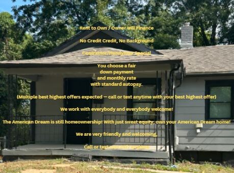 Property Id: 2366585 (NEGOTIABLE) Rent to Own/ Owner financing - handyman special - NO credit check. Homeownership OPPORTUNITY. Ideal for handymen, contractors, and cleaners. Needs tlc in the living room, kitchen, and bath. STOP renting. Be a homeowner. Act now; a down payment secures keys today! 30-year agreement for deed. You choose a fair down payment and a fair monthly rate. Closing via a third party: title company or notary. Discover Visual Video — 1st File, Helpful Guides, Video Testimonials and Photos — Are the Rest, Along with a Standard Doc File with Tips: Drive by anytime. To view, call or text and state your preferred time Quick sale expected; leave a voicemail with your max down payment and max monthly. The American Dream is still homeownership! With just sweat equity, own your American Dream home! Call or text anytime at
