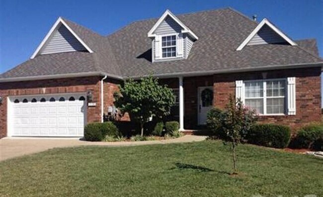 4 bedrooms, 3 baths, Walk Out Basement Master on main floor, with Spa like on-suite, HUGE walk in closet Main floor has OPEN CONCEPT with real wood floors, large 18 inch tiles in Kitchen with granite countertops with Cast Iron upgraded sink and beautiful faucet, gas fireplace, 17 foot vaulted ceilings, trey ceilings everywhere including the basement bedrooms. Corian on every windowsill. 6 panel doors, Upgraded light fixtures and ceiling fans. 3 VERY LARGE bedrooms in basement, also has THEATER room with anti-glare french doors and an extra living room and full bath, lots of storage ***Flat driveway, in CUL-DE-SAC, With a really cool view out back of an awesome Barn! ***Community Pool, Club House and Play Area, new flooring in all bedrooms and basement, new kitchen appliances minus refridgerator (tenant's will need to provide a fridge), Ozark schools are some of the best public schools in the state of Missouri,