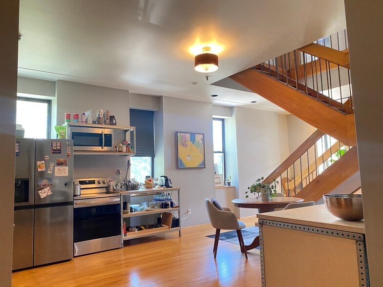 Skyline View of Downtown St Louis. Quiet dead end street in Historic Frenchtown of downtown St Louis with homes dating back to 1840. This high ceiling 3 story condo has 3 large bedrooms and a 4th loft space. Fully furnished with 3 queen beds and one king bed. Family room with huge leather couch and 60" Ultra HD Flatscreen. Keypad private entry. Two decks with views every way of downtown. Two car garage parking for an extra monthly fee.