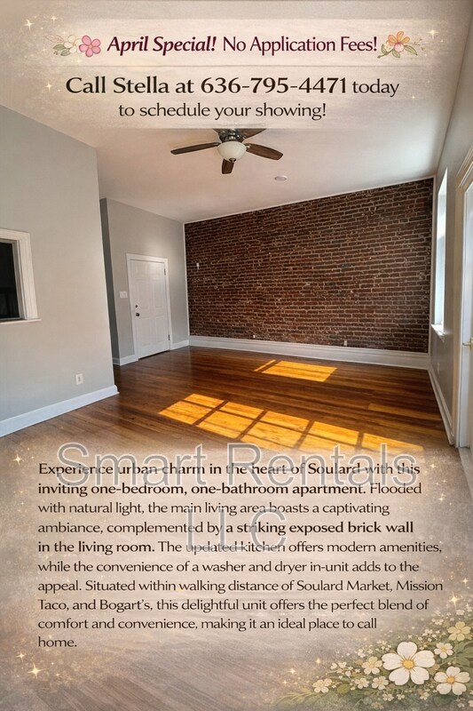 APRIL SPECIAL NO APPLICATION FEES Call Stella at today to schedule your showing! Experience urban charm in the heart of Soulard with this inviting one-bedroom, one-bathroom apartment. Flooded with natural light, the main living area boasts a captivating ambiance, complemented by a striking exposed brick wall in the living room. The updated kitchen offers modern amenities, while the convenience of a washer and dryer in-unit adds to the appeal. Situated within walking distance of Soulard Market, Mission Taco, and Bogart's, this delightful unit offers the perfect blend of comfort and convenience, making it an ideal place to call home. **Additional $99 per month for water, sewer and trash** Qualifications: NO Evictions NO Felonies NO Bankruptcies Income must be 3x the rent amount per month $300 per pet non refundable pet fee, no monthly rent for pets! Maximum of 2 pets **PICTURES MAY VARY** *Please provide us with all required information to expedite the process