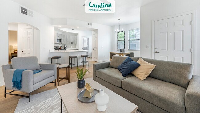 Landing offers flexible lease terms from weeks to months. Please always visit our website or contact us for the latest pricing & availability. Stay longer, save more: 6-Month Minimum base rent: starts at $3197/mo 12-Month Minimum base rent: starts at $2894/mo Landing offers flexible leases across a network of over 35,000 fully-furnished apartments throughout 375+ cities so you can rent on your terms, practically anywhere, and avoid the hassle of paying deposits or application fees. Visit to learn about all the benefits of a Landing membership, see our competitive up-to-date pricing, explore available apartments, take virtual tours, and make reservations online without jumping through traditional rental hoops. Landing's apartments at Cyan at Green Valley Apartments are designed for comfortable, easy living, with the ability to stay as long as you like. Experience living with Landing Every apartment is outfitted with all the modern essentials including: custom-designed furnishings, a fully-equipped kitchen with deluxe stainless steel appliances, a gourmet coffee maker, premium linens, Smart TVs, and incredibly fast, reliable internet for working from home. When you live with Landing, you'll enjoy a hassle-free experience with the added benefit of 24/7 access to our dedicated member experience team. Some of the nitty-gritty: a background check and proof of income are required; we're completely smoke-free; bundled utility packages and pricing vary based on length of stay; pet-friendly options available; listed price reflects a 12-month minimum stay.