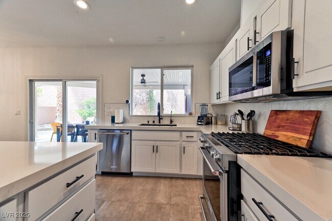 Welcome to this gorgeous open-concept cul-de-sac home in The Vistas of Summerlin, perfectly situated near Red Rock, Downtown Summerlin, parks, trails, and top-rated schools. An inviting gated courtyard greets you at the entrance, offering a warm and private welcome. Inside, the flexible downstairs den with closet can easily be converted into a fourth bedroom, paired with a convenient three-quarter bath nearby. The spacious master suite features shutters and plenty of natural light, while the kitchen showcases custom cabinetry and a sleek, modern feel. Stone tile flows throughout the main level for a clean, stylish touch. Loft is located upstairs for added living space. Step outside to your completely private backyard retreat with covered patio, stamped concrete, and built-in BBQ, perfect for entertaining or relaxing year-round. This beautiful property is offered fully furnished, making it truly move-in ready and ideal as a turnkey rental.