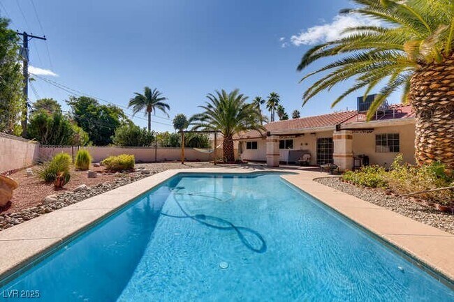 Awesome upgraded single-story home with 3 bedrooms, 2-car garage, and sparkling pool in a spacious backyard! Conveniently located just minutes from the Las Vegas Strip with easy freeway access. This home features a separate living room with a fireplace, a large updated kitchen with granite counters, stainless steel appliances, and a breakfast bar. Enjoy low-maintenance landscaping, a covered patio, and a huge backyard perfect for entertaining. Base rent is $2,699 plus a $65 monthly Resident Benefit Package, bringing the total rent to $2,764. Tenant must hire licensed and insured pool and landscaping services, transfer sewer and trash into their name, and provide monthly receipts confirming all accounts are current. Verify all fees with your agent before applying.