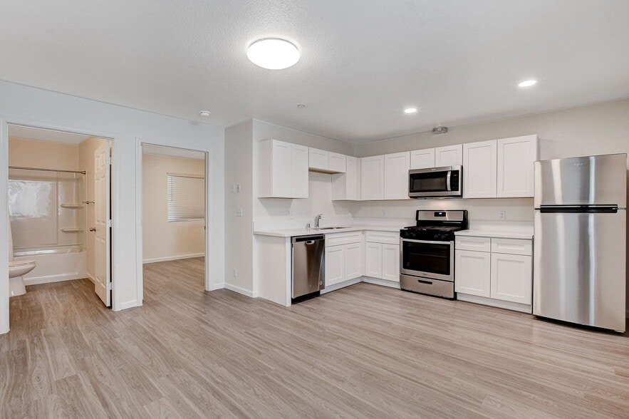 New and Beautiful 1 bedroom, 1 bathroom in great location in downtown Las Vegas. 1 story! no neighbors above or below you. New Construction was just completed for this 1 story 10 unit building. Amenities include: high end central air conditioning, new stainless-steel appliances, stylish kitchens with quartz countertops, full bathrooms, in-building laundry with brand new washers and dryers, assigned parking, secured fencing with 24-hour security cameras, and an automatic fire sprinkler system for your safety. Available October , 2023.