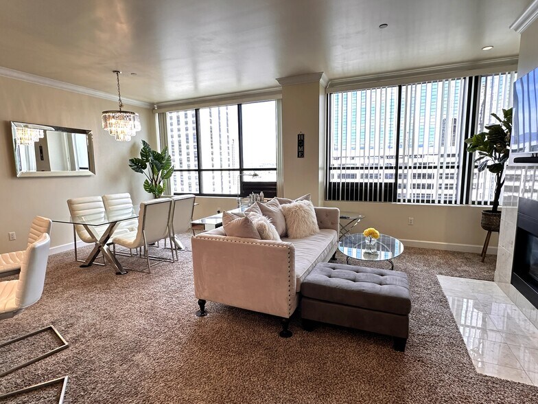 This exclusive bright and quiet 2bed/2bath (top-floor corner 1244 sq. ft.) downtown penthouse unit boasts spectacular views of the Sierra Mountains and gorgeous sunsets of the West. The unit is fully furnished and features: 2 bedrooms, 10 ft. ceilings with crown moldings, fireplace, open floor plan with panoramic kitchen, stainless steel appliances, granite counter tops and beautiful tile floors throughout the unit, new carpet in bedrooms, jacuzzi tub with jets, lights with dimmers. Abundant storage space: 3 walk-in closets, 2 linen closets, and 2 coat closets at the entrance. Washer & dryer are in the unit. The unit is pre-wired for fiber Internet. On premises, you will get to enjoy 24/7 fitness room with TVs; a large community room with lounge, kitchen, fireplace, and pool tables (for hosting a party); a media room with comfy chairs and sofas to watch your favorite movies on a big screen TV. There is 24-hour secured building access with a guard on duty & security cameras throughout the building, as well as secured on-site internal parking garage. The pool and hot tub are currently under remodel but expected to be available this summer season. The unit is perfectly located in the heart of the downtown Neon Line District. It is within walking distance to: ROC (0.1 miles), St. Mary's Medical Center (0.15 miles), UNR (0.5 miles), Renown Regional Medical Center (1.2 miles), a block from Tesla shuttle, three blocks from tranquil Truckee River & Wingfield Park with its summer concerts & downtown events, White-Water Park & bike paths, tennis courts, Movie Theater, Nevada Museum of Art, The Discovery Museum, restaurants, coffee & grocery shops, bars, casinos, nightlife, and so much more! Utilities are included in the rent!