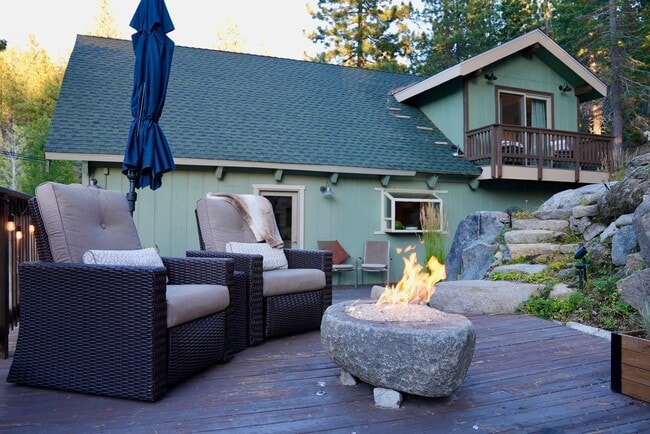 Beautiful 3 BR 2BA modern cabin home in middle Kingsbury. Main level has hardwood floors throughout the living, dining and kitchen areas and new carpet in the 2 bedrooms. Living room has gas fireplace. Modern kitchen, with an eat-in countertop, is open to the living and dining areas. Large windows and 22’ vaulted ceilings bring in the natural light. The main bedroom upstairs was expanded and fully remodeled in 2021 with hardwood floors, wood windows, and a balcony overlooking the waterfall & large deck. Bathroom has tiled floors, modern style and a steam shower. Laundry and storage are available in the oversized 2 car garage. SNOW REMOVAL and garbage service are included in the price. Level driveway and street to Kingsbury Grade make Winter access easy. Home can be rented either furnished or unfurnished. Home is available starting on 1/2/2026 for up to 3 month lease.
