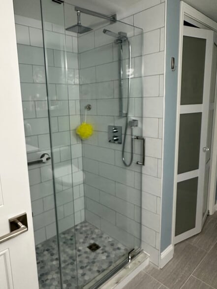 - A primary suite with custom closets and a recently updated bathroom featuring quartz countertops, double sinks, and a tiled walk-in shower