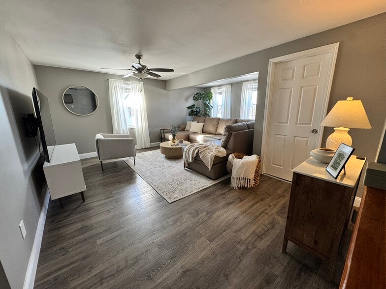 Both bedrooms are generously sized with good natural light and closet space. The bathroom has been nicely updated with modern finishes, giving it a clean and refreshed look.