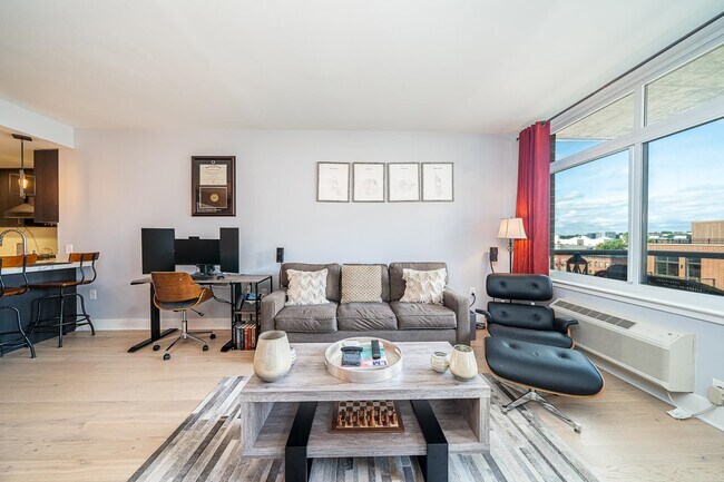Luxurious waterfront living in uptown Hoboken. This spacious 1 bedroom, 1 and 1/2 bath, plus dining area features custom brick exposed walls, and light fixtures. Bedroom and 1/2 bath features custom wood paneling making this modern floor plan feel more rustic. This beautiful home offers wide plank oak floor throughout, elegantly designed kitchen with Quartz countertops, and top of the line appliances; including Thermador and Bosch, Nest operated heating/cooling system, and full-sized washer/dryer in unit. Outdoor custom wood flooring on balcony, optimizes western sunlight exposure for bright and airy living. This full service building features an astonishing array of world-class amenities; rooftop pool, grills, and lounge area, childrens playroom, multi-floor gym, yoga and billiard rooms, and residents lounge. Walking proximity to ferry or bus with shuttle service provided to Path train. Available for 10/1 lease start date
