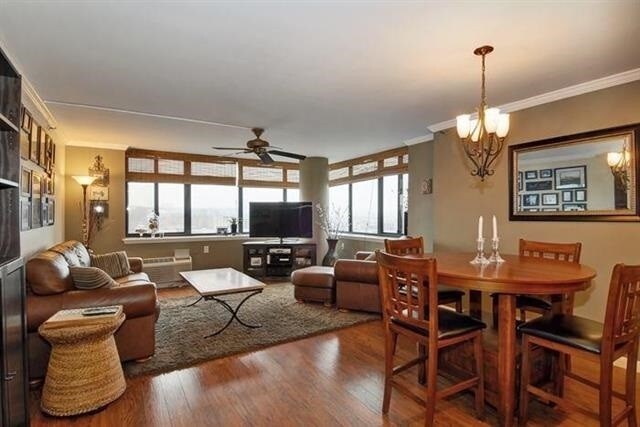 Enjoy this corner 2 Bed / 2 Bath condo with partial NYC skyline views and abundant natural light throughout. The updated kitchen features granite countertops, cherry cabinetry, and stainless steel appliances, complemented by two updated full bathrooms. Hardwood floors run throughout, along with generous closet space. The open living and dining area offers a comfortable layout with great light. A convenient washer/dryer room is located just outside your door. No need to worry about street parking—this home includes one assigned parking space. The Skyline offers a range of amenities, including a part-time doorman, valet parking, fitness center, community room, and complimentary shuttle service to the PATH. Ideally located near shops, restaurants, parks, PATH, and bus transportation—making everyday living easy and convenient.