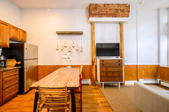 Welcome home to 134 Coles Street in Downtown Jersey City, a ground floor apartment in a historic 3 family residential building. No fee fully furnished apartment is ready for corporate housing, traveling nurses, and digital nomads, Just minutes to NYC, this fully furnished 800 sf apartment is in the best part of the city. Enjoy elegant tall ceilings, a private patio, private laundry, next to the most amazing Hamilton Park and where pets are welcome! There is a bonus semi private sleeping area in addition to the large bedroom where both sleeping areas are equipped with smart flatscreen TV work stations. Catering to relocation and monthly term residents, both sleeping areas have a loft bed for extra storage space. The large kitchen and bathroom have plenty of cabinets and storage. Wi-Fi, all utilities, cookware & dinnerware, and bed linens are included.