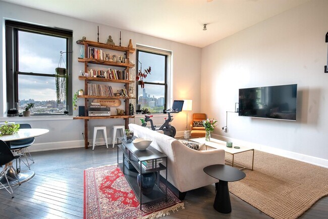 Well maintained multi level loft style apartment in historic Pohlmanns Hall on a tree-lined street. Unit has high ceilings, an open living area, spiral staircase and two huge 8' windows that give a panoramic view of New York City and lots of natural sunlight. Hardwood floors throughout, renovated kitchen and bath. Elevator building with shared laundry across from the unit. Communal garden, BBQ yard, bike storage. Close to Riverview Park, buses to NYC, 100 steps down to Light Rail and Hoboken. Comes with 1 parking spot included.