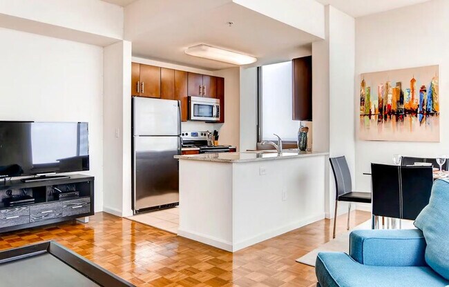 The advertised rate of $9,363/month is the lowest available price, based on a 30 day(s) stay with a move-in date of May 9, 2026. Rates vary depending on the duration of stay, season, and other parameters. For exact pricing and additional pricing components, please visit our website and enter your desired move-in and move-out dates. The rate is applicable when billed upfront; it can be higher if billed in multiple payments. Feel at home in this luxurious high-rise apartment, soaring 50 stories above the Hudson River in Jersey City. This peaceful oasis is perched on the edge of the river. This apartment features upscale furnishings, tall ceilings, and a gourmet kitchen with stainless steel appliances, including a full-size fridge and freezer, an electric stove, an oven, a microwave, and a dishwasher. The dark wood cabinets are stocked with dishes, cookware, utensils, a coffee maker, and a blender. The bathroom features masterful tile work and modern fixtures, plus towels and toiletries. Essential amenities include a flat-screen TV, washer and dryer, high-speed wireless internet, heat and air conditioning, and linens. Covered parking garage is available. Pool passes are available upon request prior to check-in. Two pool passes will be provided for Studio and 1-bedroom apartments and four passes for 2-bedroom apartments. Located in Downtown Jersey City, this apartment offers a better value than anything you’d find across the Hudson, with easy access to NYC via the ferry or the PATH train. The walkable neighborhood is just a block from Newport Centre. The high-rise is conveniently located down the street from the NY Waterway Ferry, the Hudson-Bergen Light Rail, and the PATH train. The garage will be inaccessible from 6th Street and Washington Blvd from 2 AM to 2 PM the next day. Guests will need to sign an authorization form for any pool incidentals, including a missing pool pass. [SI]
