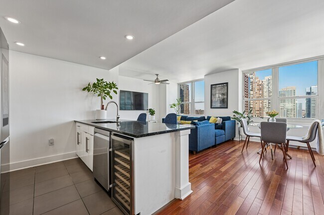 Bright and spacious corner residence at the desirable 88 Morgan featuring large windows overlooking Hudson River and NYC. This well-appointed home offers an open-concept living and dining area with hardwood floors throughout and an abundance of natural light. The modern kitchen includes granite countertops, stainless steel appliances and a breakfast bar. The bedroom is generously sized with a custom closet and equiped with remote controlled shades. A thoughtfully designed home office or dressing area provides added flexibility. Residents enjoy full-service luxury building amenities including 24-hour concierge, fitness center, outdoor pool, residents’ lounge, and landscaped outdoor spaces such as a rooftop. Prime Downtown Jersey City location with immediate access to waterfront walkways, dining, shopping and PATH Train transportation