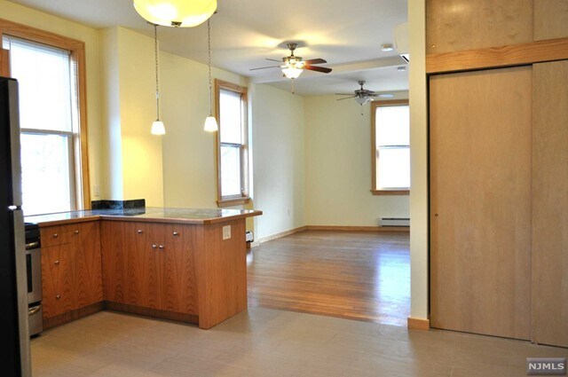This is a bright and sunny, open and airy, 2nd floor apartment in a mixed use building in the heart of Mahwah. Great location, close to NJ Transit, shops and parks. Kitchen has SS appliances, tile floor and peninsula with room for counter seating -- in addition to a separate dining area. Large living room with wood floor. Bedroom with large closet and additional storage on top. Ceiling fans as well as wall wall A/C units. Laundry in unit. Large windows provide lots of natural light, with blinds provided. Two parking spaces. Tenant responsible for all utilities, tenant insurance, first $150 of any repair, 1.5 month security and 1 month broker fee. Landlord takes care of snow removal. Credit and reference check, proof of income required. Per LL's request, LL's agent will run credit through TransUnion ($45 per applicant) and will prepare lease documents. Preference is for longer term (2 year) lease. Available early January 2023. Photos taken prior to current tenancy.