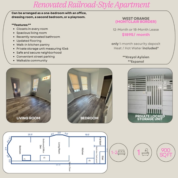 Property Id: 2331887 **ESPAÑOL** **HAITIAN KREYÒL 1BR PLUS FLEX ROOM FOR AN OFFICE or EXTRA BEDROOM West Orange / Montclair Border $1,895/month | 1-month security 12 or 18-month lease Heat & hot water included Tenant pays only electric & gas FEATURES: Closets in bedrooms Flex-room: can be office/2nd bedroom Renovated bath (2021) Walk-in kitchen pantry Private locked basement storage (10x6) Updated flooring (2025) New cabinets (2026) New ductless vents (2026) Routine extermination (interior and exterior) 24/7 Cameras in building LOCATION: Great location near parks, cafés, schools, and transit NJ Transit Bus 101 to Port Authority (2 blocks) Bay Street trains to NYC Penn (8 min drive) Equal Housing Opportunity