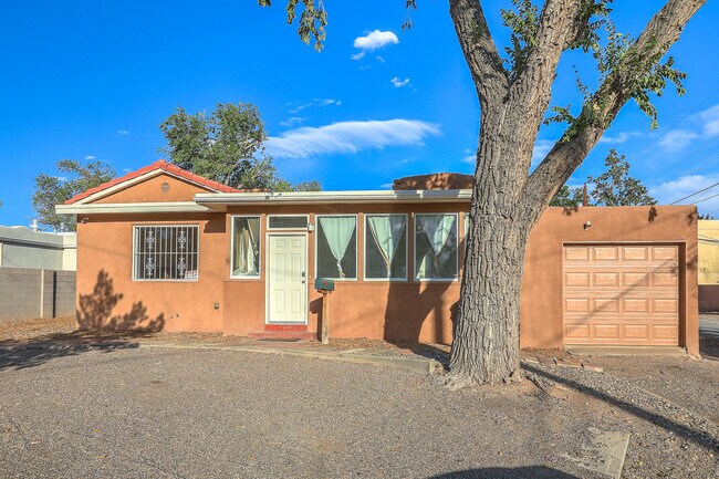 This adobe home built in 1928, renovated from the original home in 2014 and updated in 2023 includes: enclosed foyer, open living & dining rooms, newly renovated bathrooms, hardwood floors throughout the first story, Updated windows that give plenty of lighting, an attached garage with plenty of parking in the crescent driveway. This large lot has a massive back and side yard, with a large gate attached to the alley entrance. In the heart of historic Spruce Park the large single family home is minutes from the University of New Mexico, UNM hospital, Presbyterian Hospital and Nob Hill. With plenty of parking spots in the heart of Albuquerque you can easily get anywhere with an entrance to the freeway about a mile away. The home is fully furnished with five of the six bedrooms set up with beds and the sixth set up as a shared space that could easily become a sixth bedroom. One bedroom upstairs does have an attached bathroom. Each closet sports large storage with added closet organizers. The house is ready to move in with all cooking, eating and prepping material already inside. Each bedroom has its own key and lock to guarantee safety and privacy, with the front door on a code for all tenants to share. There is a large mudroom with hall tree to use upon entrance, and all public spaces are fully furnished.
