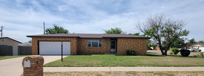 This wonderful large brick home is near Sandia School on quiet street, 3 large bedrooms, loads of storage, large rooms, central heat and cooling, double garage with electric opener, gas heat, updated flooring throughout, large patio, cement block fence and more. A must to see. No pets