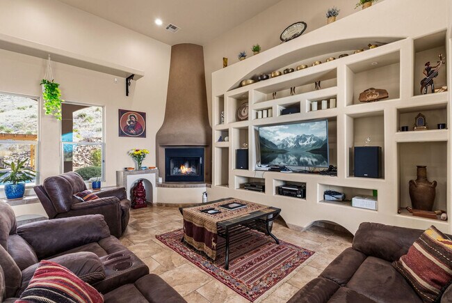 The advertised rate of $29,540/month is the lowest available price, based on a 30 day(s) stay with a move-in date of August 1, 2026. Rates vary depending on the duration of stay, season, and other parameters. For exact pricing and additional pricing components, please visit our website and enter your desired move-in and move-out dates. The rate is applicable when billed upfront; it can be higher if billed in multiple payments. Step into your ultimate Las Cruces getaway and feel at home in this 5-bedroom retreat, perfect for connection, celebrations, comfort, and desert sunsets. Nestled in the breathtaking Organ Mountains on a private 60-acre mountain retreat, this secluded estate comfortably accommodates up to 12 guests. This spacious 3,000 sq ft home features a large, airy layout with a fully stocked, well-equipped kitchen showcasing stunning mountain views and high-end stainless appliances. Gather around two indoor fireplaces, enjoy the outdoor fireplace, or unwind by the fire pit under the wide New Mexico sky. Enjoy resort-style amenities, including a private pool, hot tub, two saunas, and multiple outdoor living spaces. Stargaze from the rooftop deck with its cozy seating area and fire pit table. Guests can stay active and entertained throughout their stay, from a modest weight room to friendly competitions on the ping pong and pool table in the garage. Outdoors, the fun continues with backyard badminton, horseshoes, and corn hole! The heated pool is available for $200 per night. Up to 2 dogs are allowed for $125 per stay, no cats please. The pool spa has complimentary heat. Just 15 minutes from Las Cruces, this expansive retreat offers total privacy and freedom to unwind. Nearby attractions include the Organ Mountains–Desert Peaks National Monument, Dripping Springs Natural Area, White Sands National Park, Prehistoric Trackways National Monument, and the New Mexico Farm & Ranch Heritage Museum. Enjoy nearby restaurants such as The Shed, D. H. Lescombes Winery & Bistro, La Nueva Casita Cafe, Si Señor Restaurant, and A Bite Of Belgium. Renting a car is a convenient option to explore the area at your own pace. Check-in is at 4pm and check-out is at 10am. Violations of the no parties policy may result in immediate termination of the stay. We kindly ask that your dog be crate-trained and that you pick up after them. Guests must be 21 years or older to book this property. Bedroom 4 includes a dedicated workspace. [SI]