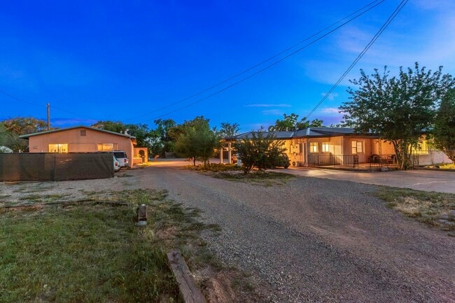 Bright 1BR Duplex with Skylight Kitchen and Private Yard – 30 Min to Taos, Santa Fe, and Los Alamos Looking for peaceful, private living with easy access to town? This spacious 1-bedroom duplex is located in a quiet, gated compound and offers a large, open layout with comfort, charm, and functionality. This unit has its own entrance and fenced yard. It’s the left side of the duplex (green roof), as seen in the drone photo, nearest the street. The kitchen is large and bright, with stainless steel appliances, a full-size washer and dryer, room for a dining table, and a skylight that fills the space with natural light. It opens into a generous living room with space for multiple couches and a large TV. A cozy gas heater warms the whole house during the winter months. The bedroom is oversized with a large closet and space for dressers. The full bathroom has a granite countertop and bathtub. Outside, you'll find a small yard, patio area, and a metal storage shed. Designated parking for two vehicles is included. Located in a gated community with long-term neighbors, this home is just 30 minutes from Santa Fe, Los Alamos, and Taos. Ideal for professionals or anyone looking for peace, privacy, and access to nature. Pet policy: Small dog or cat allowed with $30/month pet rent. No pitbulls or large dogs. Utilities: Flat rate $250/month for water, sewer, gas and electricity. Long term tenant - minimum 1 year lease. There is no smoking allowed on the property, even outside. Please call or text for more information.