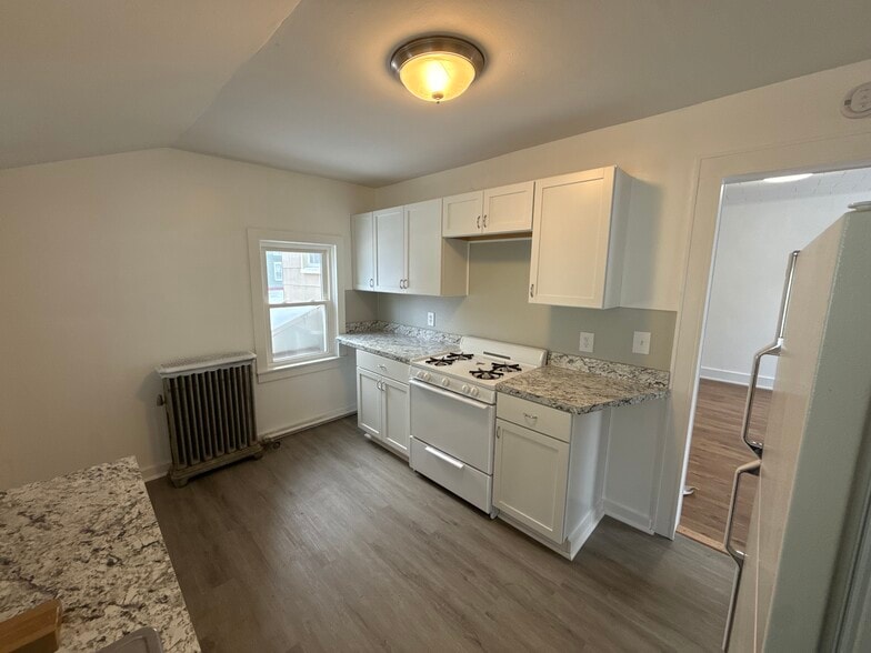 This downstairs three bedroom unit has been completely renovated with every surface of the apartment touched. The layout of the apartment includes 1 large, 1 medium, and 1 smaller sized bedroom, freshly painted, including all doors & trim, and has brand new carpet. The main living spaces, consisting of a large living room as well as a formal dining area have tremendous natural light & brand new luxury vinyl tile flooring. The new flooring flows into the spacious kitchen as well. You'll notice new cabinets & counters. Custom shelving and storage are ample in the apartment. All lighting & plumbing fixtures are brand new. There is also a large, closed in porch! One off street parking space is assigned to this unit, and there is laundry, shared with the upstairs unit, in the common area. This home is in a great neighborhood & centrally located with easy access to everything you'll need. Perspective tenants should be prepared to supply references, provide income documentation, and have sufficient credit. This is a non-negotiable smoke free and pet free unit. Unit is plus utilities. If interested in setting up a private viewing, please respond with your phone number. Thank you! One year lease is required. First month rent plus security deposit due at lease signing.