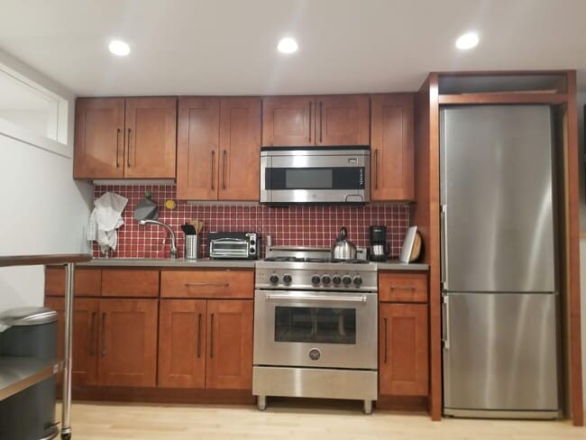 Duplex with garden. Great neighborhood a block from the subway station. Large room downstairs for play room, rec room, office. Can be furnished or unfurnished.