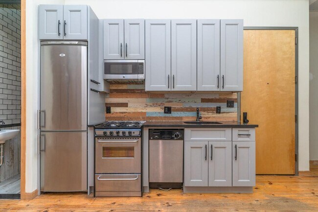 PRIME Bushwick location right by Maria Hernandez Park! Right outside your door, you can find an actual full size grocer (I know, right?), countless bodegas, coffee shops, bars, restaurants, locally owned businesses, thrift and antique shops, music and dance venues? the list goes on and on! You?ll never find yourself bored around here and for those days where you don?t feel like being out, you?ll have a pretty sweet building to stay in as well. Conveniently located off the L and M trains, as well as the B38, B57, and B60 bus lines. UNIT FEATURES: Hardwood Floors Stainless Steel Kitchen Dishwasher and Microwave Central A/C and Heat Private Balcony Shared Backyard Laundry Room Pet Friendly! First & Security NO FEE