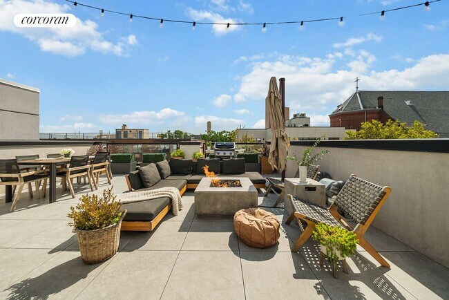 If you like to entertain, look no further! Welcome to unit 4F, a well proportioned one-bedroom one-bathroom apartment with a massive private roof deck with breathtaking views of Manhattan. This deck is accessible directly from the apartment and faces the Freedom Tower as well as the trees on Devoe Street. In addition, the deck comes FURNISHED with a charcoal fire pit, a huge seating area, electric outlets, a water faucet, a large dining space and a storage shed. However, that's not all. There is also a wonderful balcony right off the living room! The unit features central heat and air and an in - unit washer dryer. Enjoy the benefits of having a coat closet in the entry way, a small office area at the top of the stairs, plus a private storage space in the basement. There are recessed lighting and stylish pendant lights. The open concept kitchen features elegant wood-grain cabinets with push - to - open mechanisms, light grey granite waterfall counter tops with a large breakfast bar, and built in shelves for easy access while you're cooking. Top of the line appliances include a Fisher and Paykel fridge with French doors, Bosch gas range with a pot filler above, and a paneled Bosch dishwasher that blends right in to the lower cabinets.The large living room can accommodate a comfortable seating area and features stunning 5" White Oak floors and oversized Pella windows. With floor to ceiling sliding glass doors, the view of the trees is beautiful! The extra-large bathroom has been outfitted with a custom glass divider, a wall-mounted toilet, heated floors, double sinks, a medicine cabinet, and a large vanity with multiple drawers for extra storage. The full size tub has built in shelving, and a rain shower. The spacious bedroom can accommodate a Queen sized bed plus additional furniture, and has a generous custom closet with fittings.Nestled among local neighborhood hotspots including C.Lo Cafe, Il Passatore, Hosh Yoga, Grimm Ale House, Sage, Blue Stove Cafe, Win Son, and Mesacoyacan. The L train at Graham Ave is a short walk from 289 Devoe, just 3 stops into Manhattan getting you to Union Square in less than 15 minutes! Take a beautiful stroll to Cooper Park and enjoy this peaceful neighborhood with gorgeous tree-lined streets, bike lanes, and easy street parking.