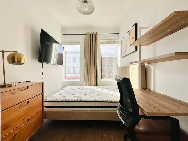 Room for rent: This private Queen room in a 4 bedroom / 2 bathroom apartment, located in Bushwick is available on a flexible 1-18 month lease - Furnished room in a 4 bedroom, 2 bathroom recently renovated apartment with exposed brick walls - Building has a rooftop, gym, laundry, lounge and a bike room! - Trains: 5 min walk to J train Chauncey St station or 4 min walk to L train Bushwick Ave - Aberdeen St station, 23 minutes to Manhattan - One block away from cafe?s, restaurants, gym, bars. - Located right next to the Thomas Boyland Park - Location: Granite St and Broadway