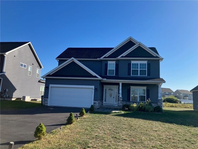 Beautiful 3 bedroom,2.5 bath Colonial. Huge great room,24x14,large covered front porch,kitchen has granite countertops,pastel cupboards,all appliances,gas stove,large pantry. Laundry on second level wit front loading washer & dryer. Primary bedroom is 16 x14 with huge walk-in closet & full bath. Front bedroom is 14x13 with walk-in closet,first floor rear bedroom is 14x13 with double closet. 9ft ceilings,basement is full with egress window,High Effic furnace with central air. Churchville Chili schools.