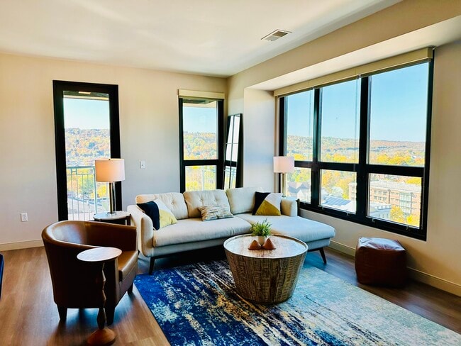 Harold's Square features 78 thoughtfully designed apartments. Each apartment boasts high-end finishes such as quartz countertops, stainless steel appliances, luxury vinyl plank flooring, and in-unit washers and dryers. Select units offer private balconies and stunning views of Cayuga Lake and the surrounding hills.