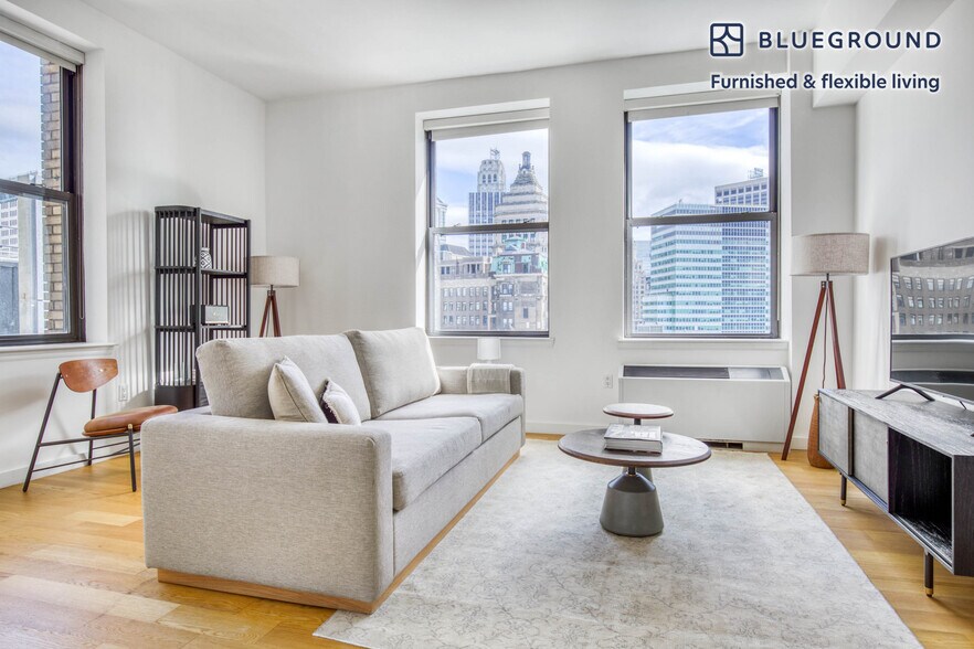 Discover the best of New York, with this one bedroom apartment in Financial District with high floor views over the city. It’ll be easy to simply show up and start living in this furnished apartment with its fully equipped kitchen, living room, and our dedicated, on-the-ground support. (ID #NYC667) The advertised rate of $5,740/month is the lowest available price, based on a 12 month(s) stay with a move-in date of June 15, 2026. Rates vary depending on the duration of stay, season, and other parameters. For exact pricing and additional pricing components, please visit our website and enter your desired move-in and move-out dates. The rate is applicable when billed upfront; it can be higher if billed in multiple payments. Brokers are welcome to reach out. Were you looking for an unfurnished lease? Try Blueground instead and upgrade from unfurnished to furnished living: - Furnished at rates comparable to unfurnished - No setup or furniture costs - save thousands - Move-in ready - save time, just bring your suitcase Designed with you in mind Thoughtfully designed with bespoke finishes, modern furnishings, and a fully equipped kitchen, you’ll enjoy that “I’m home” feeling with this Blueground apartment. Whether you’re lounging in your spacious living room streaming the latest and greatest entertainment on the smart TV or premium wireless speaker, or getting some well-earned rest on the superior quality mattress with luxury linens, you’ll fall in love with everything this Financial District apartment has to offer. This apartment also offers in-floor laundry. Sleeping arrangements Queen Bed, 63in/160cm Amenities Building amenities unique to this one bedroom apartment include an on-site: - Doorman - Dryer of floor - Elevator - Washing machine on floor - Lounge - Pets allowed Arrival and ongoing support The entire apartment is yours to enjoy! Throughout your stay, you’ll have access to our Client Experience team through the Blueground App. You can schedule additional cleanings, submit maintenance requests, and view our neighborhood recommendations with just a few taps. We’ll share all details upon confirmation of your stay. Ideally Located This furnished apartment is located in the Financial District, also known as FiDi. Home to Wall Street, One World Trade Center, the South Street Seaport, and Bowling Green it is a constant hub of activity. During the week the sidewalk is always bustling and the restaurants are filled with professionals. The glittering skyscrapers and well-known landmarks make this one of the city’s most recognizable and historic neighborhoods. By subway, Times Square is about 20 minutes away. Other things to note Building amenities may have an extra cost. This Blueground apartment has flexible lease options, allowing you to book it for one month, a year, or more. Pets are welcome, though weight limits and breed restrictions apply and may incur fees. Brokes CYOF. We take great pride in ensuring every photo displayed is shot in our own units with our actual furnishings. That said, we regularly refresh our decor and furniture arrangement, which may differ from what’s pictured. Also note - The apartment's building is undergoing renovations, and you may hear construction noise inside your apartment from time to time [SI]