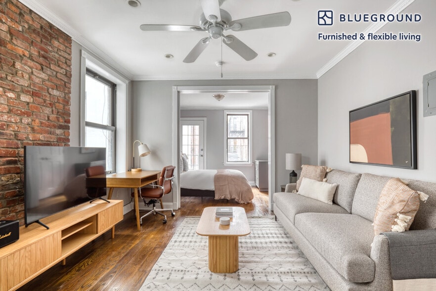 Show up and start living from day one in New York with this bright one bedroom Blueground apartment. You’ll love coming home to this thoughtfully furnished, beautifully designed, and fully equipped West Village home with stunning balcony views over the city. (ID #NYC1073) The advertised rate of $5,530/month is the lowest available price, based on a 1 month(s) and 2 day(s) stay with a move-in date of January 25, 2026. If you’re looking for a 1-year stay, the rate is $6,290/month. Rates vary depending on the duration of stay, season, and other parameters. For exact pricing and additional pricing components, please visit our website and enter your desired move-in and move-out dates. The rate is applicable when billed upfront; it can be higher if billed in multiple payments. Brokers are welcome to reach out. Were you looking for an unfurnished lease? Try Blueground instead and upgrade from unfurnished to furnished living: - Furnished at rates comparable to unfurnished - No setup or furniture costs - save thousands - Move-in ready - save time, just bring your suitcase Designed with you in mind Thoughtfully designed with bespoke finishes, modern furnishings, and a fully equipped kitchen, you’ll enjoy that “I’m home” feeling with this Blueground apartment. Whether you’re lounging in your cozy living room streaming the latest and greatest entertainment on the smart TV or premium wireless speaker, or getting some well-earned rest on the superior quality mattress with luxury linens, you’ll fall in love with everything this West Village apartment has to offer. This apartment also offers in-apartment laundry. Sleeping arrangements Queen Bed, 63in/160cm Amenities Building amenities unique to this one bedroom apartment include an on-site: - Dryer - Washing machine - Pets allowed Arrival and ongoing support The entire apartment is yours to enjoy! Throughout your stay, you’ll have access to our Client Experience team through the Blueground App. You can schedule additional cleanings, submit maintenance requests, and view our neighborhood recommendations with just a few taps. We’ll share all details upon confirmation of your stay. Ideally Located This furnished rental is located in the West Village. Cute storefronts and some cobblestone streets give the charming neighborhood the feel of a quaint small town. Populated with shoppers, diners and art lovers. The historically artistic area has numerous piano bars, cabarets, and theaters to discover. Both Times Square and Wall Street are just 15 minutes away by subway. Other things to note This Blueground apartment has flexible lease options, allowing you to book it for one month, a year, or more. Pets are welcome, though weight limits and breed restrictions apply and may incur fees. Please keep in mind that this is a walk up building. Brokes CYOF. We take great pride in ensuring every photo displayed is shot in our own units with our actual furnishings. That said, we regularly refresh our decor and furniture arrangement, which may differ from what’s pictured. [PL]