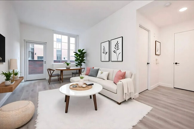 The residences exemplify contemporary functionality and style. Natural light pours through oversized windows, highlighting warm wood tones and chic stone surfaces. The thoughtful layouts feature custom built-in closets that allow for ample storage with select homes outfitted with an in-unit washer/dryer.