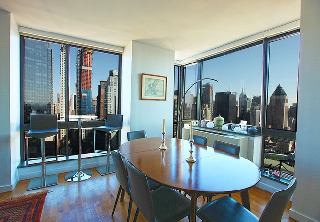 Sprawling two bedroom, two bathroom apartment perched high up in the sky on the 48th floor! This one-of-a-kind corner unit offers panoramic, unobstructed skyline views with a glimpse of central park and the river from some rooms. It's a much sought-after and rarely available line - and as a result of the current tenant breaking the lease, you will be taking over at a below market rate rent! Apartment is available July 1st. APARTMENT FEATURES: - Floor-to-ceiling windows- Hardwood wood floors- Stainless steel kitchen - Master bedroom offers walk-in closet with ensuite bath- Plenty of storage throughout apartment with tall and deep closets throughout- Elegant entry-foyer- Double pane windows and 48th floor setting offers a tranquil and peaceful atmosphere so you hear absolutely no city noise- pets allowed- DishwasherBUILDING FEATURES: Doorman elevator Elevator pets Pets Allowed Bike Room Children's Playroom Concierge Gym Laundry in Building Parking Available Community Recreation Facilities Deck Garden Patio Roof DeckLOCATION: Superb location! Located just one block away from Columbus Circle, you have the 1, 2 A, D subway lines in a one block distance as well as multiple bus lines. Moreover, the N, Q, R, W subway lines are located just three blocks away. Central Park is also just one block away and the varied dining options, shopping stores, grocery stores and cultural activities are located all within the vicinity.