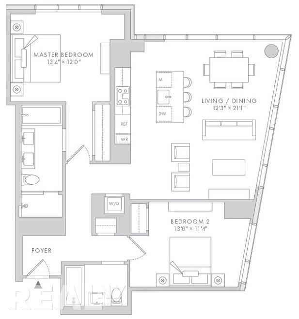 Two Waterline #430 is a northeast-facing two-bedroom, two-bathroom with stunning city views. The entry foyer leads to the living and dining room with an open kitchen including a waterfall island, wine refrigerator, fully-vented range hood, waste disposal, and an appliance package designed by Bosch. The residence features a vented washer/dryer, and a five-fixture bathroom in the master suite, making it a truly unique and elevated offering.Spanning nearly five acres and built around a new three-acre landscaped park, Waterline Square is the culmination of a thriving riverfront neighborhood 25 years in the making, where Midtown meets the Upper West Side.Residents will have a life that transcends expectations with over 100,000 square feet of sports, leisure, and lifestyle amenities including an indoor tennis court, basketball court, squash court, soccer field, half-pipe skate park, 25m lap pool, kids pool, steam rooms, saunas, state of the art gym, yoga studio, pilates studio, boxing studio, rock climbing wall, playroom, gardening studio, recording studio, art studio, bowling alley, golf simulator, and dog playground.