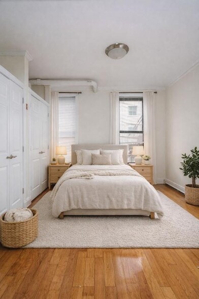 Welcome to your new home! This beautifully designed one-bedroom apartment offers the perfect balance of style and comfort. The hardwood floors throughout add a warm and polished touch to the entire space.The modern kitchen features custom cabinets and generous counter space, making meal prep a breeze. The living area is expansive, offering plenty of room to relax, entertain, or create a dedicated workspace. The bedroom comfortably fits a queen-sized bed and comes with ample closet space for all your storage needs. The renovated bathroom includes a sleek shower/tub combo for added convenience.At Real New York, were redefining the moving experience with a team of experts who truly understand the NYC market. With over 1,000 exclusive listings and access to 100% of available apartments, were committed to helping you find your perfect homewhether in a full-service building or a charming walk-up.Fees includes $20 application Fee, 1 months rent, and 1 month security deposit.