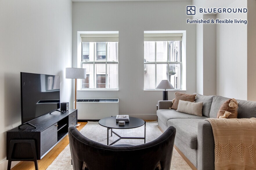 Show up and start living from day one in New York with this beautiful one bedroom Blueground apartment. You’ll love coming home to this thoughtfully furnished, beautifully designed, and fully equipped Financial District home with stunning high floor views over the city. (ID #NYC1339) The advertised rate of $5,390/month is the lowest available price, based on a 11 month(s) and 29 day(s) stay with a move-in date of April 25, 2026. Rates vary depending on the duration of stay, season, and other parameters. For exact pricing and additional pricing components, please visit our website and enter your desired move-in and move-out dates. The rate is applicable when billed upfront; it can be higher if billed in multiple payments. Brokers are welcome to reach out. Were you looking for an unfurnished lease? Try Blueground instead and upgrade from unfurnished to furnished living: - Furnished at rates comparable to unfurnished - No setup or furniture costs - save thousands - Move-in ready - save time, just bring your suitcase Designed with you in mind Thoughtfully designed with bespoke finishes, modern furnishings, and a fully equipped kitchen, you’ll enjoy that “I’m home” feeling with this Blueground apartment. Whether you’re lounging in your sophisticated living room streaming the latest and greatest entertainment on the smart TV or premium wireless speaker, or getting some well-earned rest on the superior quality mattress with fully stocked linens, you’ll fall in love with everything this Financial District apartment has to offer. Sleeping arrangements Queen Bed, 63in/160cm Amenities Building amenities unique to this one bedroom apartment include an on-site: - Doorman - Dryer in building - Elevator - Game room - Washing machine in building - Lounge - Library - Media room - Pets allowed - Playroom - Rooftop BBQ Arrival and ongoing support The entire apartment is yours to enjoy! Throughout your stay, you’ll have access to our Client Experience team through the Blueground App. You can schedule additional cleanings, submit maintenance requests, and view our neighborhood recommendations with just a few taps. We’ll share all details upon confirmation of your stay. Ideally Located This furnished apartment is located in the Financial District, also known as FiDi. Home to Wall Street, One World Trade Center, the South Street Seaport, and Bowling Green it is a constant hub of activity. During the week the sidewalk is always bustling and the restaurants are filled with professionals. The glittering skyscrapers and well-known landmarks make this one of the city’s most recognizable and historic neighborhoods. By subway, Times Square is about 20 minutes away. Other things to note Building amenities may have an extra cost. This Blueground apartment has flexible lease options, allowing you to book it for one month, a year, or more. Pets are welcome, though weight limits and breed restrictions apply and may incur fees. Brokes CYOF. We take great pride in ensuring every photo displayed is shot in our own units with our actual furnishings. That said, we regularly refresh our decor and furniture arrangement, which may differ from what’s pictured. [SI]