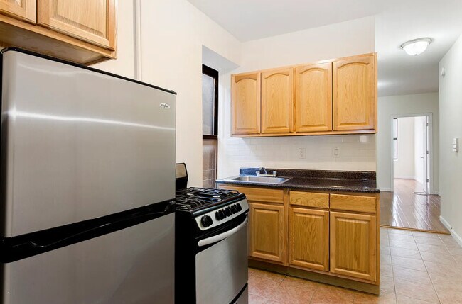 Newly renovated apartment: newly stained hardwood floors, new kitchen appliances, new kitchen cabinets, new bathroom tiling on both the floor and the walls, new bathroom sink, reglazed bathtub, new paint.