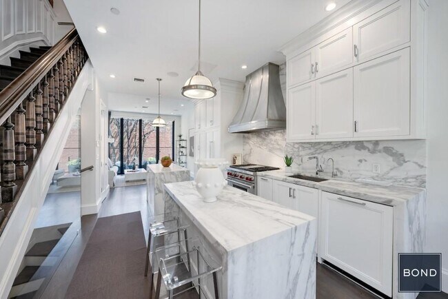 Spectacular and turn-key, FULLY FURNISHED 109 West 132nd Street is a gut-renovated Brownstone that seamlessly blends 19th century classicism with the practical technology that makes life run smooth. iPad controlled Sonos media systems, individual A/C systems for different floors, and your Wi-Fi signal throughout the house coexists elegantly with original details like fireplace mantles, exposed brick, wainscoting -- even the new facade of the original 19th century Neo-Georgian design. The OWNER'S APARTMENT FOR RENT is the back half of the Garden Level and the Townhouse's 4 stories. Interior has an open flow, with 3 or 4 Bedrooms, 5 Baths. Parlor Floor is a 12 foot ceiling'ed space centered around the Carrera marble-topped twin-island Kitchen. With a Wolf range, stainless steel vented range hood from France, custom cabinetry, marble counters, backsplash and a Fisher Paykel refrigerator, the Kitchen the heart of the house. The Living and Dining areas radiate out from it. At the rear of the Parlour Floor, step through floor-to-ceiling bi-fold insulated glass doors that open the entire back wall onto the stone Deck, for al fresco dining. Head downstairs and enjoy the open Backyard Garden. Downstairs in the Media Room / 4th Bedroom, identical immense floor-to-ceiling bi-fold glass doors open directly onto the wood-fenced Backyard Garden. Below is the finished Basement. Above the Parlour Floor is the Third Floor, where the substantial Laundry Room with full size Washer/Dryer is located. The Third Floor has 2 Bedrooms, each with an ensuite Full Bath. The Fourth Floor is the luxurious Primary Suite and Bath. The Primary Bedroom features a ventless fireplace by Hearth Cabinet, and a custom Walk-in Closet. Adjoining this is the Carrera marble clad Primary Bath: freestanding oval tub, large double vanity, translucent glass enclosed private toilet, and a ventless fireplace. A glass enclosed Shower Room, with ceiling rainshower, completes this refuge from reality. One flight up is the stone and wood Roof Deck. Sunbathe, nap or entertain guests amidst city views of Upper Manhattan.THE NEIGHBORHOOD The tree-lined block of West 132nd between Lenox Avenue and Adam Clayton Powell Boulevard is home to the 132nd Street Community Garden, known for their jazz parties and cookouts. It's also close to Whole Foods and restaurants on Lenox Avenue. Mount Morris Park is a few blocks away. Easy transportation to midtown Manhattan on the 2/3 and 4/5/6 subway.Built 1910, Gut-Renovated 2017 - Between Lenox Avenue & Adam Clayton Powell Blvd - Brownstone Walk-up - 3000 square feet - 16 feet wide. Top to bottom gut renovation with original details and exposed brick - New electrical and plumbing - Multi-room sound system - Full height folding glass patio doors on two floors - Dual-island custom Kitchen with Wolf stove, custom French hood and waterfall marble backsplash - Full-floor Primary Suite with Carrera marble Bath - Solid wood doors - Suspended steel Roof Deck, with stone pavers, contemporary steel railings, storage, lighting, and optional plumbing - High efficiency Fujitsu split-ducted HVAC on each floor - Private Backyard Garden has no rear adjoining neighbor.BOND New York Properties is a licensed real estate broker that proudly supports equal housing opportunity.