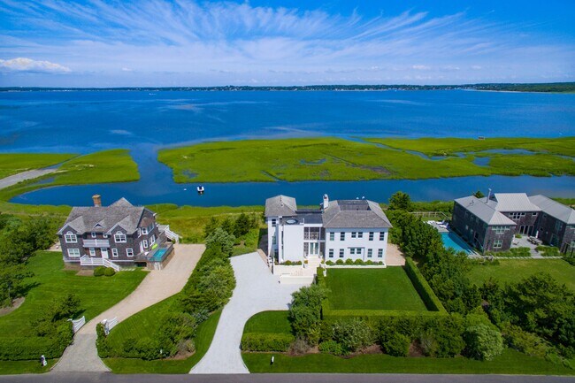 Stunning custom-designed home offers 140 +/- waterfront with dock on the Shinnecock Bay, magnificent sunsets, and across the street, immediate access to ocean beaches. Superior design creates luxurious living, starting with the entry foyer and includes all amenities with modern, up-to-the-minute, eat-in-kitchen, wide-open living and dining areas that access outdoor decks on two levels. Water views from almost every room, with three gas fireplaces, one outside, one in the living room, and one in the master suite. In all: five bedrooms, five baths, two powder rooms across 5100+/- square feet. This one is a show-stopper. Rental Terms: Two Weeks: $90,000 July: $160,000