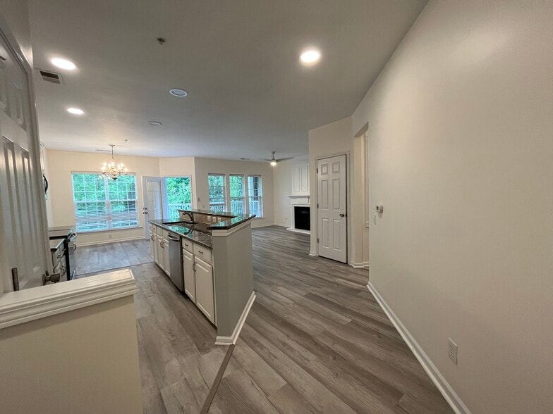 Best end unit condo in Belle Vista. New flooring - no carpet at all! The move-in ready unit is completely re-painted including doors and ceilings. Granite counter-tops with open floor plan. Brand new stainless-steel refrigerator, microwave, dishwasher, and oven. Master suite with huge walk-in closet. Additional third room is perfect for an office or study. One of the largest units at 1,503 square feet. Second floor condo with a balcony overlooking wooded area. Second and third bedrooms share a full bathroom and have a private hallway with door for privacy. Located in the heart of Ballantyne. This wonderful gated community features include an outdoor pool, clubhouse and pond and is walking distance to restaurants, shopping, and entertainment! This Ballantyne beauty will not last long!