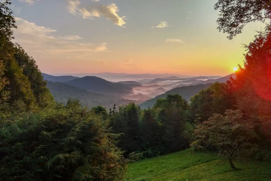 Relax and enjoy the views and climate at over 4,000' elevation. Enjoy spectacular sunrise views all year long and fall/winter sunset views! The constant gentle breeze will keep you comfortable and refreshed. The property is one level with an upscale 2 bedroom, 2 en-suite bathroom cabin style house with a light filled kitchen and open design. It has an enormous deck (covered and uncovered) for enjoying the outdoors and entertaining. It also has an extension, separated by a covered breezeway, with a full bath, studio living area, and wood burning stove. There is a covered gas grill and an open fire pit area. There is beautiful hiking right from the house and friendly neighbors. Nature and wildflowers abound. It is 10 minutes from the Pine Creek Lake Glenville boat ramp. It is mostly paved except for the final mile, which is accessible without four wheel dive. It is a short drive to Franklin, Highlands, Cashiers, and Sylva. 2026 Pricing: $3,000 per month for one-year rental of the entire property $1,000 per week for weekly rental of the entire property (Sunday - Saturday) $1,850 per month for one-year rental of just the extension (1bed, 1bath, kitchenette)