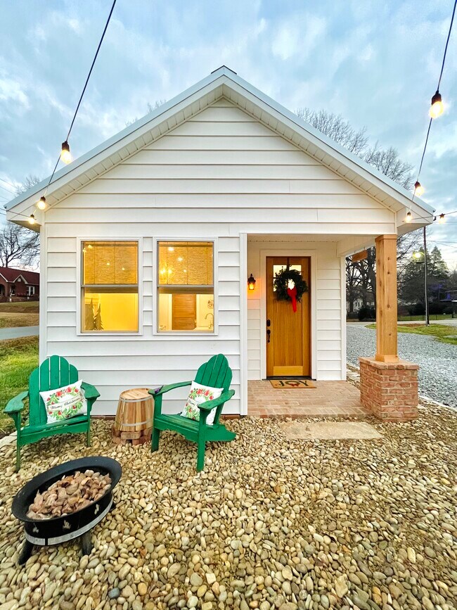 *BUNKHOUSE IS OCCUPIED* We have 4 other Steiny Houses just blocks away from this property with the same floor plan and furnished. Serious potential tenants message me for details and a link to website. What anyone desires in a large fancy home, but boiled down to a small footprint. This home offers quartz counter tops, compact dishwasher, soft closed drawers/doors, heated tile flooring in the bathroom, stacked washer dryer, fireplace, smart TV and a view of the horse pasture from the booth! This property is located 2 blocks away from Village Park and less than .5 from all that downtown Kannapolis has to offer. Perfect stay for 2 travelers.