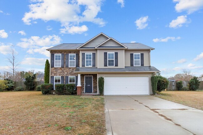 4 Bedroom, 2.5 Bathroom home on a large lot in Liberty Chase subdivision in Raeford. First floor features open concept floor plan. Living room with fireplace, dining space and large kitchen with granite counter tops, stainless steel appliances, island and pantry. Additional room downstairs with french doors can be used as an office/playroom/formal dining room. All bedrooms, large loft and laundry room located on the second floor. Large primary bedroom with trey ceilings. Primary bathroom has double vanity, garden tub with separate shower. 3 additional great size bedrooms with large closets. Sunroom off the kitchen. Large fenced in back yard with storage shed. 2 car garage. Pets subject to owners' approval will require a $250 non-refundable pet fee. Pink bedroom is in process of being painted a neutral color.