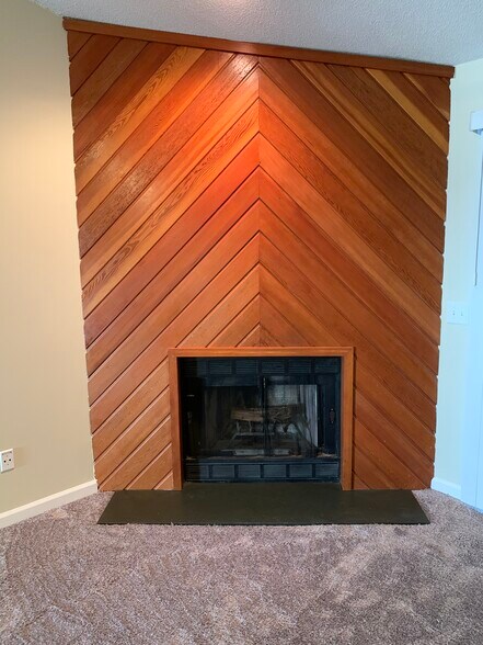 Spacious great room with vaulted ceiling, fireplace, spacious balcony and lots of natural light.