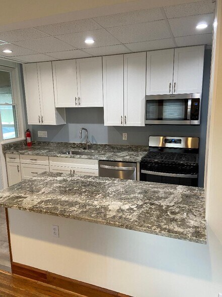 Spacious two story brick townhouse with beautiful all hardwood flooring and matching trim has 2 large bedrooms and one full bath with marble walk-in shower. Rooms have high ceilings with ceiling fans and living room has a decorative brick fireplace. The kitchen comes with granite countertops, matching stainless steel refrigerator, gas range, dishwasher and over-the-range microwave. There is a full basement with loads of storage and a washer and dryer hook-up. There is covered front and rear porch and off-street parking is available. Renters pay for gas and electric utilities. Please contact Bill by phone at 6-one four-five54 - zero694 only for more info and to schedule a showing. Available immediately.