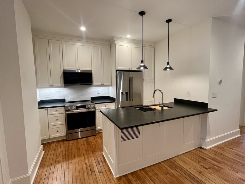 Newly updated historic apartment Chef's kitchen with induction stove Hardwood floors Wood burning fireplace Large basement Spa-inspired bathroom with double shower heads Patio with fenced backyard Garage parking spot Pets are welcome